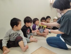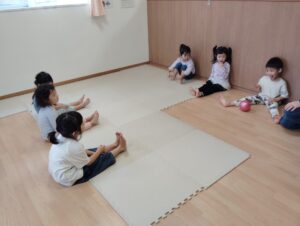 トライアングルの音が鳴ったら、お友だちめがけてボールを転がします!鳴るまで待てるかな?