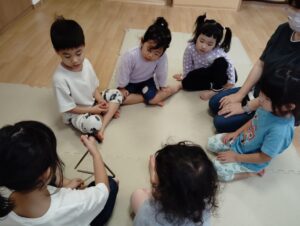 いつもは先生とだけれど、今日はお友だちへ上手に転がせたね