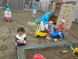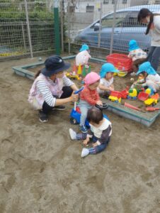 お散歩の後は、園庭で遊んでいたタンバリン組のお友達と合流し一緒に遊びました☺️砂遊びに