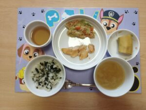 今日の給食🍌わかめごはん・カレイの照り焼き・キャベツの納豆和え・みそ汁(サツマイモ、たまねき)バナナでした✨️