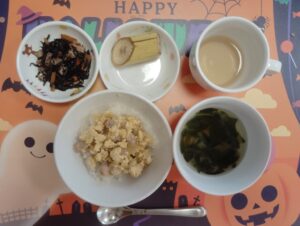 親子丼、ひじきの炒り煮、中華スープ(人参、小松菜)、バナナ