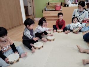 楽しそうに、タンバリンを叩いて音を鳴らしてます。