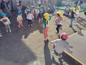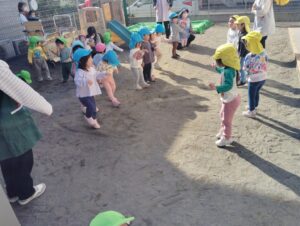 今日は天気が良かったので、園庭に出て、みんなでリズム体操を行いました!