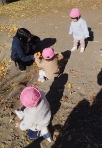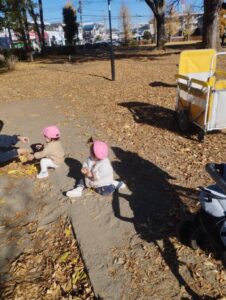 隣のお友達が落ち葉🍁を沢山集め遊んでいるのを見てやりたいなぁ〜なんて思っている様子でした✌️一緒に遊ぼうしてみたらと声かけると、ニヤっと笑ってましたよ🤭可愛いですね~😍