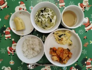 今日の給食🥢ごはん・カジキとじゃがいものケチャップ煮・マカロニと卵のサラダ・中華スープ(白菜、わかめ)・バナナでした😋