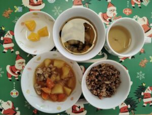 鮭ひじきごはん・鶏じゃが・すまし汁(白菜、わかめ)・オレンジ