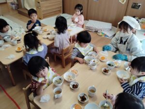 外でたくさん身体を動かしたのでお腹が空いたのか、そぼろ丼をたくさん食べておかわりをする姿がたくさん見られました。
