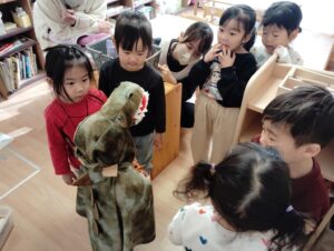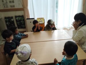 いろんなクラスを回った後の朝の会でも恐竜のまま参加しました。笑
