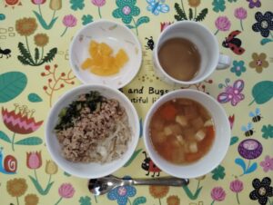 今日の給食🍊三色丼・けんちん風汁・オレンジでした😋