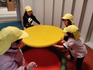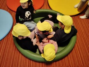 丸いマットを、みんなで協力して取り出して、円の中に「プールみたい!」と、仲良く入っていました。