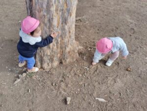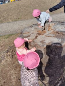 大きな木の幹を見つけ、登ってみたり、触れたりして、遊んでいました☆