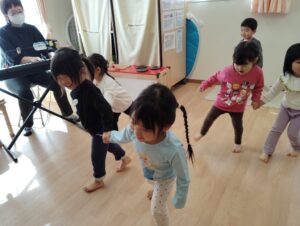 リズムに合わせて歩く時に「〜ちゃんと、手を繋ぎたい」と誘ってみたり、ペアでやるリズム遊びもお友だちと考えながら上手に出来ていましたよ☆☆☆