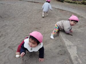 しばるく坂になっている砂場の様子をうかがっていて、お友だちが入ると続いて砂場に足を入れていましたよ😁