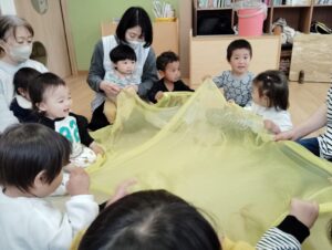 みんなで布を持ち楽しそうですね♪