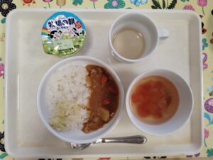 チキンカレー・キャベツのアチャール風・コンソメスープ(トマト、えのき)・ヨーグルト