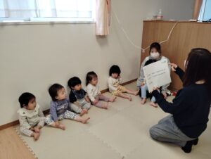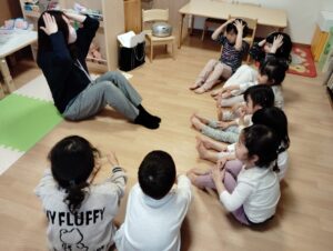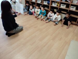 タンバリン組さんは、最初は昨年度と違う部屋で英語をするのでドキドキしていました。