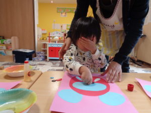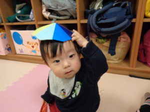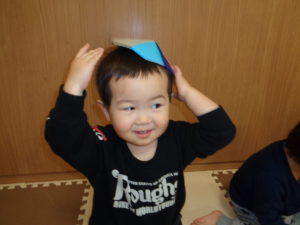 今日は雨が降っていたのでカスタネット組さんはお部屋で折り紙でつくったコマを回しましたが