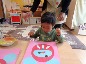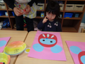 タンバリン組さんはダルマの福笑い。どんな顔になったかな?