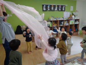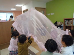 いつもより大きなひらひらの布をみんなで持ち上げてふんわ~り✨