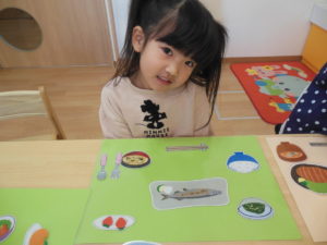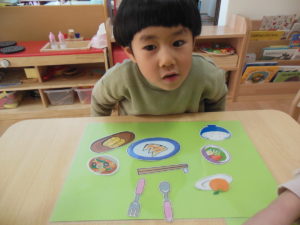 このあと先生にアドバイスをもらって、みんな品数についてや、ご飯、汁物、食具の位置についてなどもう一度考え、