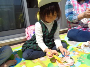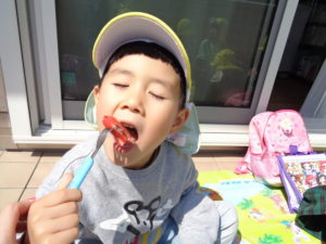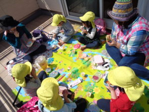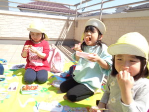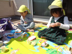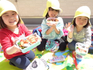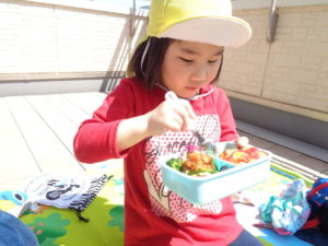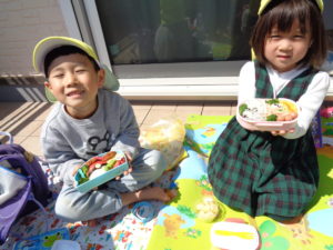 園外に出られないのは残念でしたが、園内の2階のテラスで、おうちの人がつくってくれたお弁当をいただきました☆