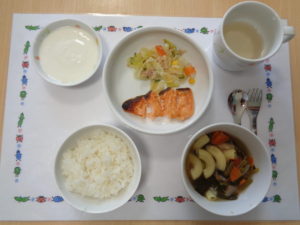 ごはん・さけのタンドリー風焼き・キャベツサラダ・ミネストローネスープ・ヨーグルト