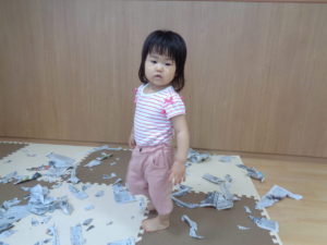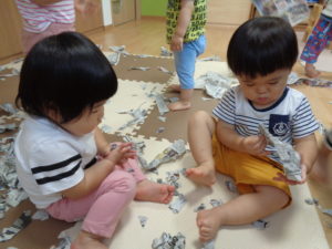 小さくちぎちぎとちぎったり、大きく丸めてボールにしたり、新聞紙が大変身したね(^^♪