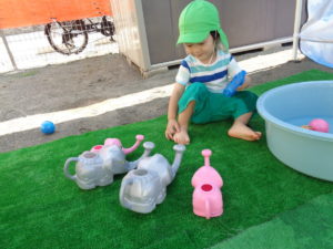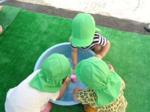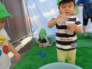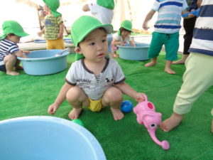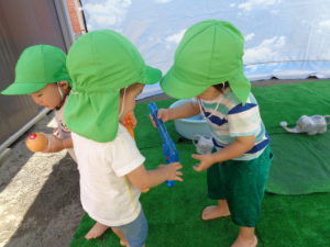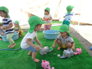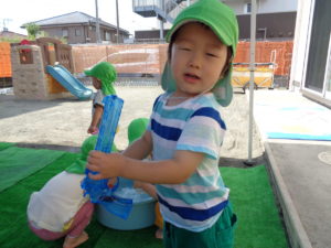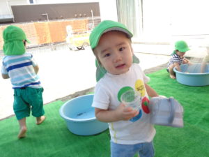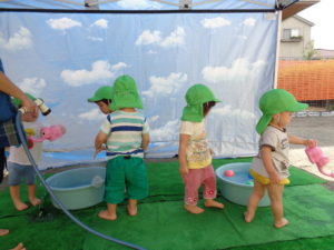 全クラス、園庭で水遊びをしました。