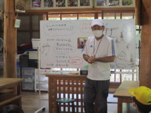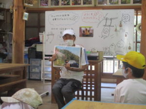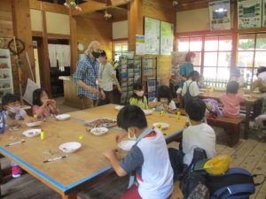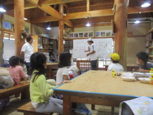 木のぬくもりのある建物の中で、山の中に住む動物たちのお話を聞いたり、ミニクイズに答えたりしました。