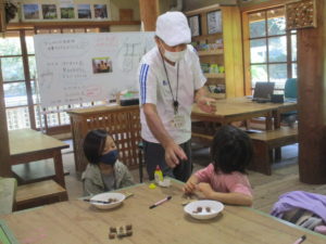 勝負のあとは、部屋の中でどんぐりゴマで遊んだり、外で虫取り網を持って昆虫を探したり。