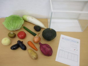 はじめに、材料の野菜と少し果物をテーブルに並べて、みんなで予想をしました(*^^*)