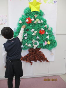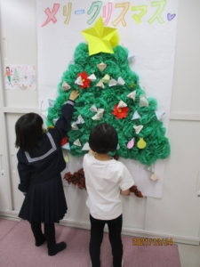 明日から冬休みに入ります。今日はクリスマスイブなので、前から準備していたクリスマスツリーの飾りを完成させました。