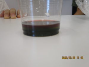 ・・・という実験だったのですが、容器が大きかったのと、なかなかそーっと入れるのは難しかったようで、コップの中の色水は混ざってしまいました。