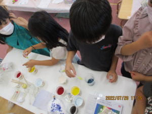 さあ、みんなで順番に色水を入れてみます。