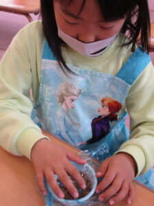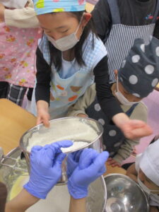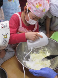 給食室の先生に来てもらって、チーズケーキ作りました。