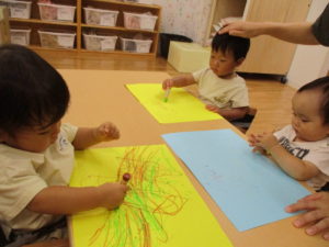 給食のときにスプーンを持って食べることができるようになってきた子が多く、クレヨンも上手に持つことができていました🌈クレヨンを机にトントンと叩いて描いたり、縦横に動かして描いたりしていました!中には丸を描くことができる子もいて成長を感じました✨思い思いに殴り描きを楽しんでいましたよ♫