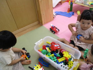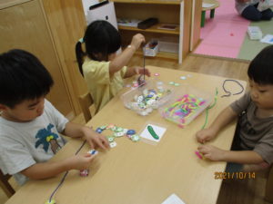 ぱんだ組さんは、部屋でひも通しをしたり、ブロックで飛行機を作ったり、