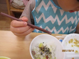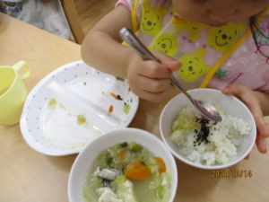 成長といえば、給食の時間にスプーンの3点もちが上手にできる子が