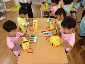今日のきりん組さんは、体操教室の後、新しいお散歩バッグを作りました。