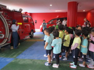たくさんいた消防士さんにドキドキしながらも、とっても上手に避難をして、消防士さんのお話も真剣に聞くことができていました😊