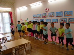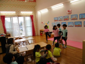 劇の練習が終わり、担任の先生が園庭に行こうと言うと、みんなは大喜び♬
