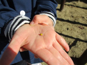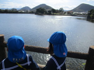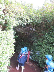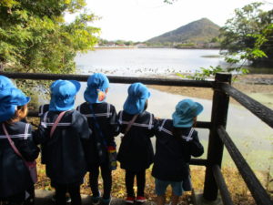 まずは公園をひとまわり。トトロが出てきそうなトンネルをくぐり、池に鳥をみつけたり、ミノムシや赤ちゃんテントウムシなど次々と発見したりして大喜びの子どもたちでした。途中、太陽に照らされる池を見ながら「水がキラキラひかってる!」、空を見上げて風に流れる雲を見ながら「雲ってうごいてるの?」などなど、とても素敵なつぶやきも聞こえてきました。