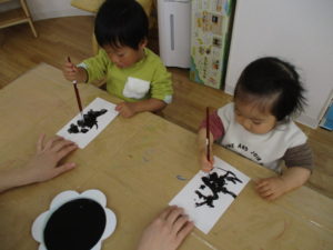 点々模様を描いている子や大胆に筆を走らせ描いている子など個性が出る書初めになりました✨