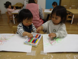 お友だちと一緒にクレヨンを使い、時には友だちに「どーぞ」と言って渡してあげる可愛い姿が見られました。