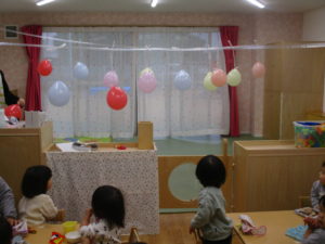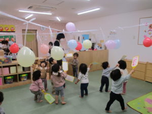 朝のおやつを食べていると、お部屋の中にたくさんの風船を吊り下がりましたよ。「何をするのかな」「わたしは赤が好き」「~ちゃんは?」などお話をしながら、色とりどりの風船をワクワクした表情で見つめるうさぎ組さんたち。