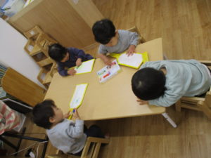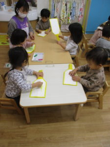 遊ぶ前に、自分の羽子板にクレヨンでお絵描きもしましたよ。思い思いに描きながら、使いたい色を伝え合ったり、順番を待ったり、貸してあげたりとお友だちや保育者とのやりとりも楽しんでいました💕