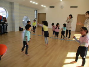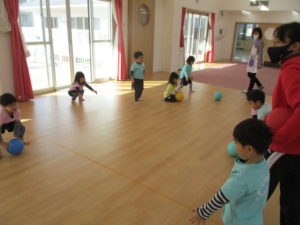 みんなの大好きな「アブラハムの子」で準備体操したあとは、ボールを転がしたり、二人組になってボールを落とさないように受け渡しをしたりして、ボールに親しみました。