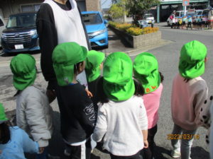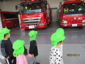 消防署に着くと、今日はたくさんの消防車が止まっていて「こっちのは大きいね!」「かっこいいね!」と大喜びの子どもたちでした🎶