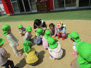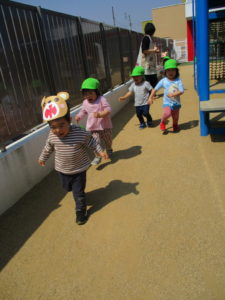 ぱんだ組さんは園庭に出て、童謡の「むっくりくまさん」の追いかけっこをしました!
