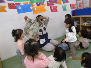 最初に先生がお手本を見せると、「わぁ~!!」「びりびり~!!」と興味津々な子どもたち✨